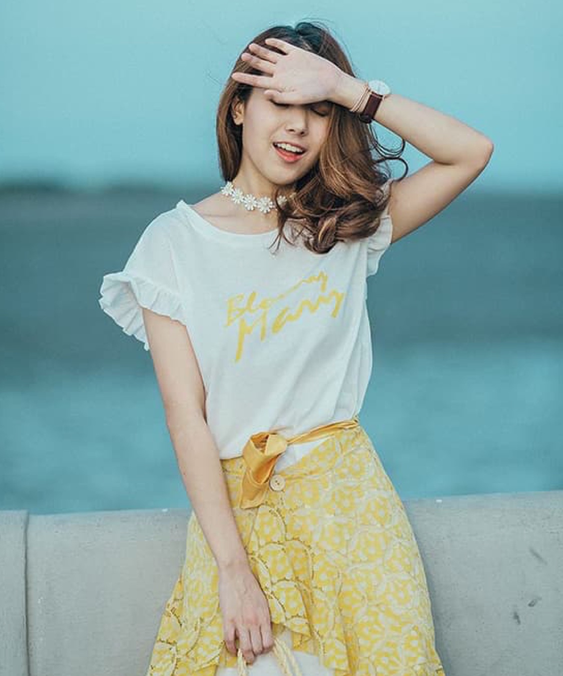 イエローには赤や緑の原色系、ホワイトには黒やボルドーの小物を合わせるのがおすすめのコーデです。